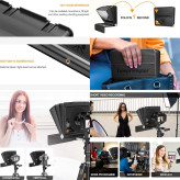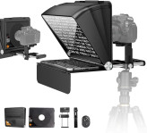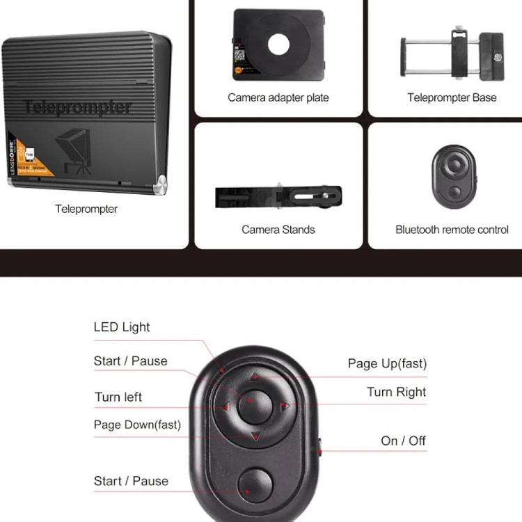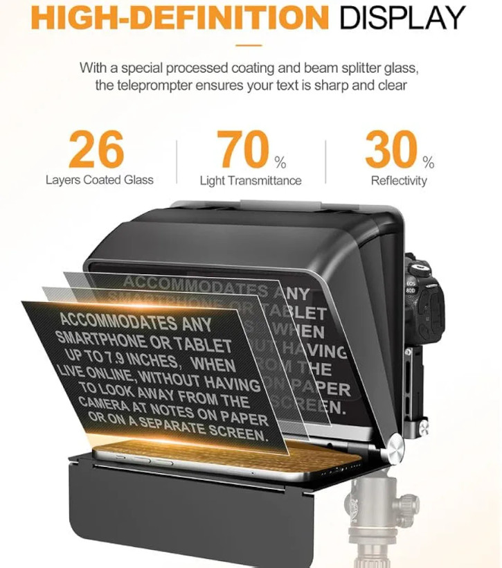 با این تلپرامپتر میتوانید به سادگی از دوربینهای DSLR، گوشیهای هوشمند و تبلتها استفاده کنید. شیشهی مخصوص beam-splitting glass باعث میشود متن بدون کاهش کیفیت تصویر در دوربین نمایش داده شود. علاوه بر این، همراه دستگاه یک ریموت کنترل بلوتوثی وجود دارد که به شما امکان تغییر سرعت اسکرول و توقف یا شروع متن را میدهد.
