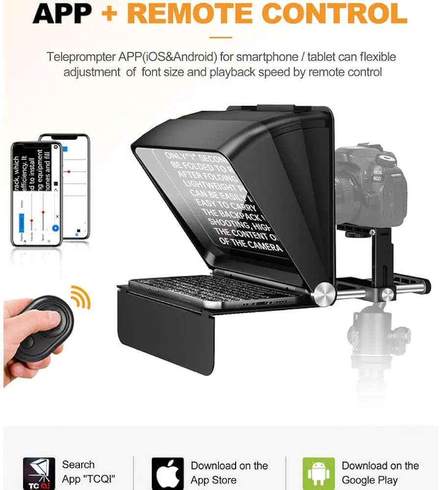 با این تلپرامپتر میتوانید به سادگی از دوربینهای DSLR، گوشیهای هوشمند و تبلتها استفاده کنید. شیشهی مخصوص beam-splitting glass باعث میشود متن بدون کاهش کیفیت تصویر در دوربین نمایش داده شود. علاوه بر این، همراه دستگاه یک ریموت کنترل بلوتوثی وجود دارد که به شما امکان تغییر سرعت اسکرول و توقف یا شروع متن را میدهد.