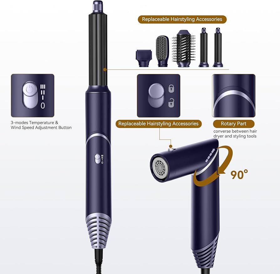 وجود ۵ سری کاربردی شامل سری براش گرد حجمدهنده، سری شانه صافکن، سریهای فرساز چپ و راست و سری سشوار خشککننده باعث شده این محصول جایگزین مناسب سشوار، اتو مو، فرکننده و براش حرارتی باشد. دمای قابل تنظیم در سه سطح و عملکرد باد سرد نیز امکان کنترل کامل را در اختیار کاربر قرار میدهد.