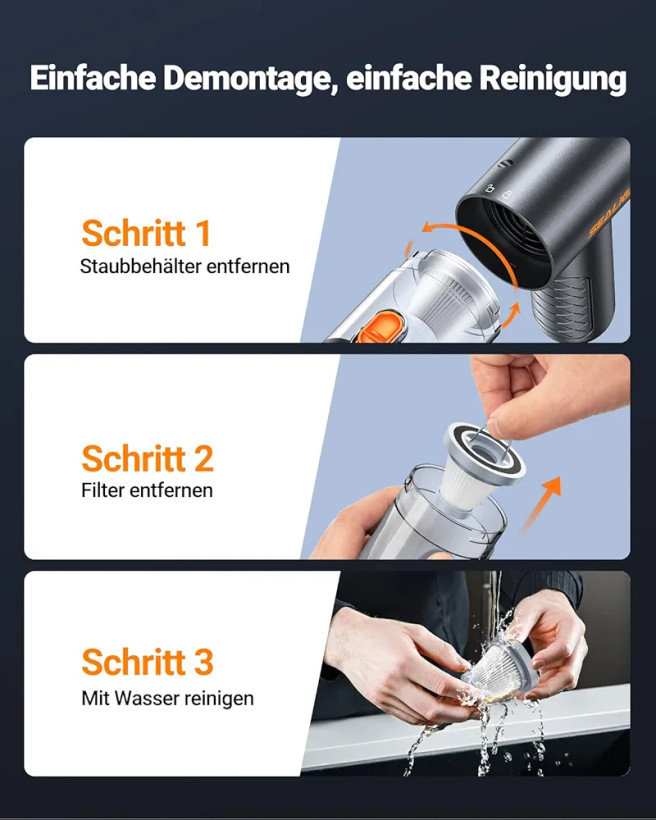 طراحی لوله باریک و نازلهای گوناگون باعث شده این محصول برای تمیز کردن نقاطی که دست به آنها نمیرسد مثل شیارها، رویه صندلی ماشین، کیبورد، قفسهها و کنارههای مبلمان بهترین انتخاب باشد. مخزن قابلجدا شدن و فیلتر قابلشستوشو نیز به افزایش طول عمر دستگاه کمک میکند و کاربر میتواند بدون هزینه اضافی نظافت را ادامه دهد.