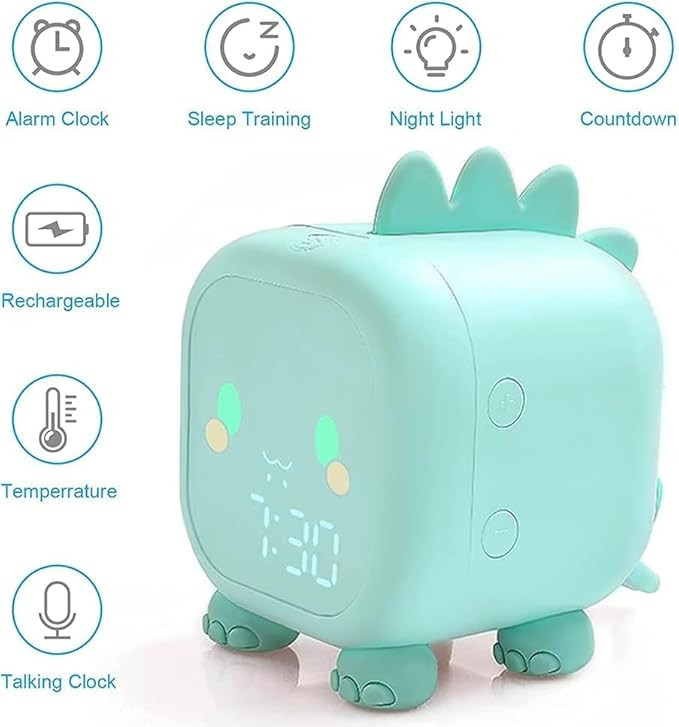 این ساعت از جنس ABS و سیلیکون مقاوم ساخته شده و وزن سبک آن باعث میشود بهراحتی روی میز مطالعه، قفسه یا کنار تخت قرار بگیرد. صفحه LED باکیفیت، اطلاعات زمان، تاریخ و دما را بهصورت واضح نمایش میدهد و قابلیت تنظیم در حالتهای ۱۲ یا ۲۴ ساعته را دارد. این ویژگی به والدین کمک میکند کودکان را با مفهوم زمان آشنا کرده و برنامه خواب منظمی برای آنها ایجاد کنند.