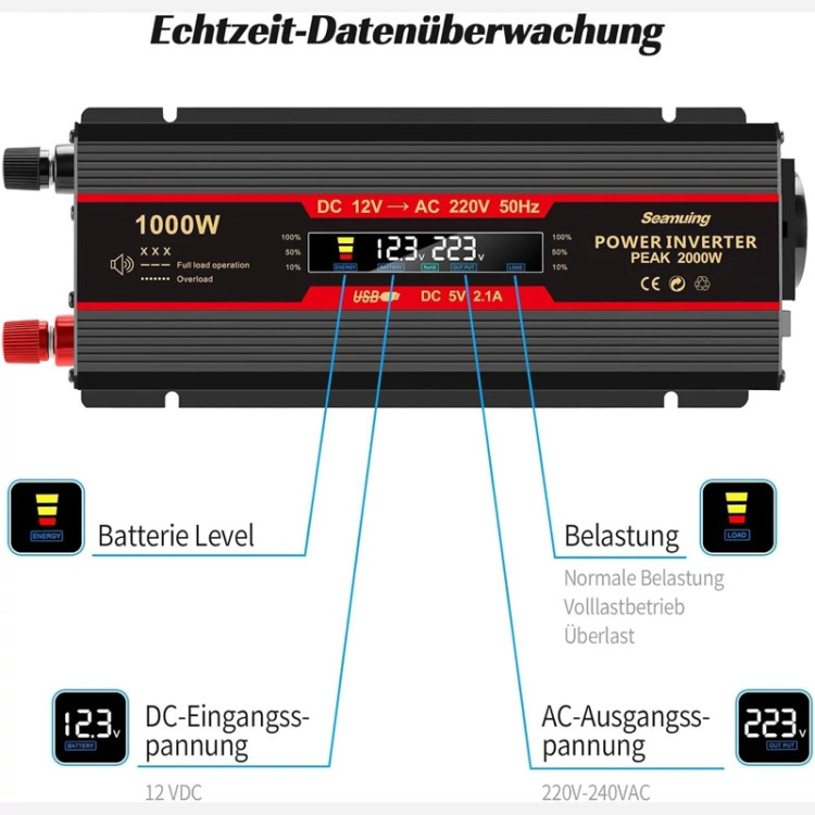اینورتر برق Seamuing مدل 7064956 یک مبدل توانمند و قابل اعتماد است که انرژی ۱۲ ولت DC (از باتری خودرو، پنل خورشیدی یا منابع برق اضطراری) را به ۲۲۰ تا ۲۴۰ ولت AC تبدیل میکند. این دستگاه با توان ۲۰۰۰ وات واقعی و طراحی مقاوم، انتخابی ایدهآل برای مصارف خانگی، صنعتی سبک و سفرهای کمپینگ محسوب میشود.