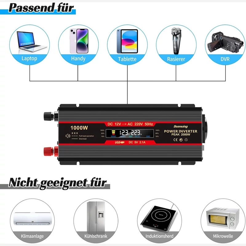 اینورتر برق Seamuing مدل 7064956 یک مبدل توانمند و قابل اعتماد است که انرژی ۱۲ ولت DC (از باتری خودرو، پنل خورشیدی یا منابع برق اضطراری) را به ۲۲۰ تا ۲۴۰ ولت AC تبدیل میکند. این دستگاه با توان ۲۰۰۰ وات واقعی و طراحی مقاوم، انتخابی ایدهآل برای مصارف خانگی، صنعتی سبک و سفرهای کمپینگ محسوب میشود.