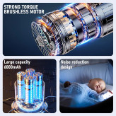 باتری قدرتمند ۶۰۰۰ میلیآمپری با شارژ سریع Type-C امکان استفاده بدون کابل را فراهم کرده و در هر شارژ، زمان کارکردی کاملاً قابل قبول ارائه میدهد. طراحی سبک و ارگونومیک باعث شده حمل و استفاده طولانیمدت از آن بدون خستگی باشد. فیلتر HEPA قابل شستشو نیز عمر بالاتری داشته و مانع انتشار دوباره ذرات ریز در محیط میشود.
