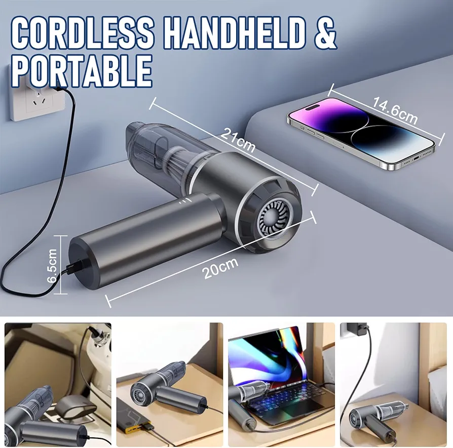این دستگاه تنها یک جارو نیست؛ بلکه یک ست کامل نظافتی ۴ کاره محسوب میشود. با کمک سریهای متنوع، میتوانید از آن بهعنوان جاروبرقی دستی، بلوئر (دمنده)، ایرداستر فشرده و پمپ باد کوچک استفاده کنید. این یعنی تمیزکاری کیبورد، دریچه کولر خودرو، داخل کنسول، گوشههای مبلمان، دمیدن گردوغبار از قطعات الکترونیکی و حتی باد کردن وسایل کوچک همگی با یک دستگاه انجام میشود.