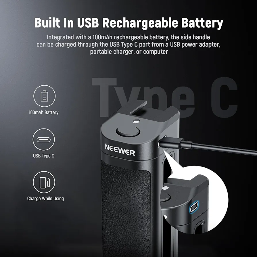 یکی دیگر از مزایای مهم این محصول، باتری قابل شارژ با ظرفیت 100mAh و پورت USB-C است که عملکرد پایدار شاتر بلوتوث را تضمین میکند. این باتری برای ساعتها استفاده مداوم مناسب است و شما را از تعویض مکرر باتریهای سکهای بینیاز میکند. علاوهبراین، وجود کفشک سرد (Cold Shoe) و رزوه ۱/۴ اینچ امکان اتصال انواع لوازم جانبی مانند میکروفون، نور LED یا سهپایه را بهراحتی فراهم میکند.