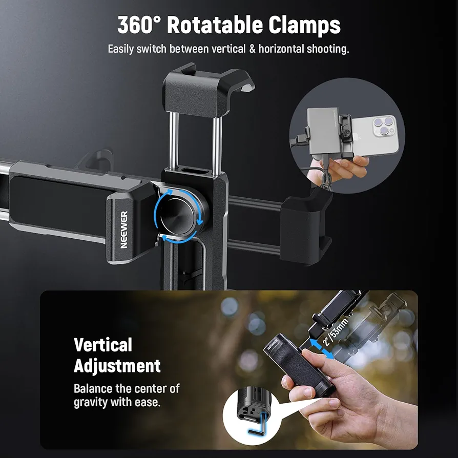 گیره هولدر این محصول بهصورت چرخان ۳۶۰ درجه طراحی شده و قابلیت تنظیم کامل در حالت افقی و عمودی را فراهم میکند. این ویژگی آن را برای تولیدکنندگان محتوا، ولاگرها، کاربران اینستاگرام، تیکتاک و حتی عکاسان آماتور به ابزاری ضروری تبدیل کرده است. همچنین این هولدر با انواع گوشیهای هوشمند سازگار بوده و با ساختار مقاوم، گوشی را بهصورت ایمن نگه میدارد.