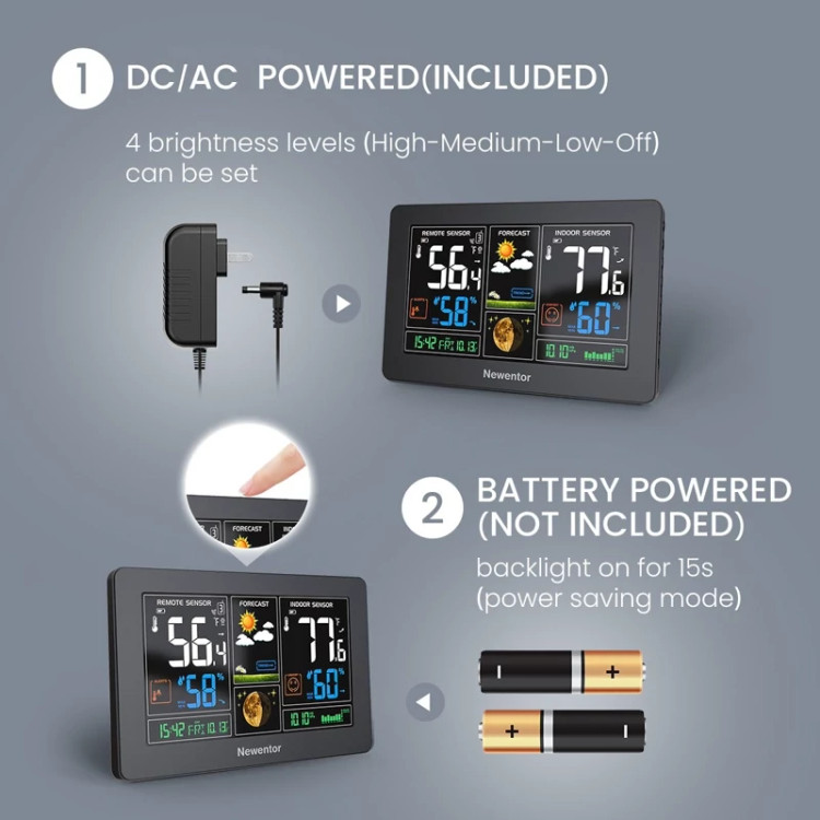 Newentor FJ3378 یک ایستگاه هواشناسی دیجیتال بیسیم پیشرفته است که با طراحی مدرن و صفحه نمایش رنگی بزرگ، امکان مشاهده دقیق دما و رطوبت داخلی و خارجی را فراهم میکند. این دستگاه برای کاربرانی طراحی شده که به دنبال مانیتورینگ لحظهای شرایط محیطی منزل، محل کار یا باغ خود هستند. قابلیت اتصال تا سه سنسور بیسیم به شما امکان میدهد همزمان چند مکان مختلف را کنترل کنید و از تغییرات دما و رطوبت بهصورت دقیق مطلع شوید.
