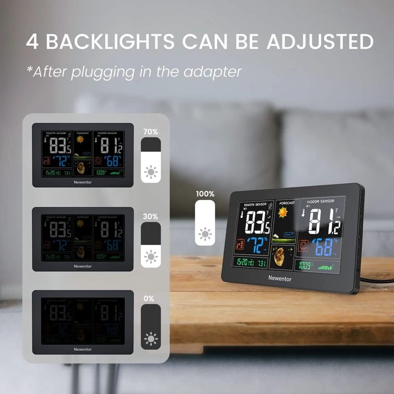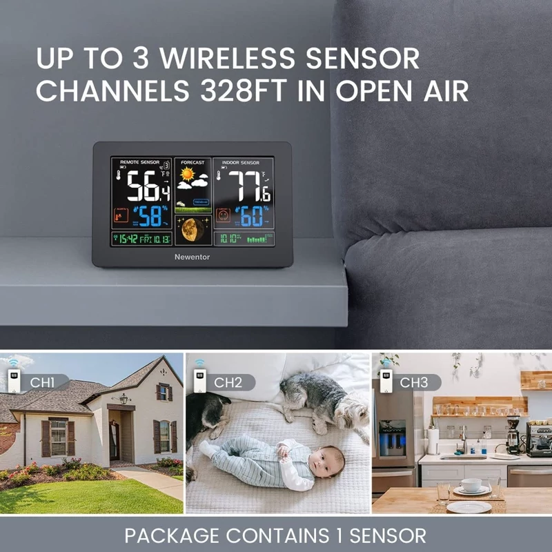Newentor FJ3378 یک ایستگاه هواشناسی دیجیتال بیسیم پیشرفته است که با طراحی مدرن و صفحه نمایش رنگی بزرگ، امکان مشاهده دقیق دما و رطوبت داخلی و خارجی را فراهم میکند. این دستگاه برای کاربرانی طراحی شده که به دنبال مانیتورینگ لحظهای شرایط محیطی منزل، محل کار یا باغ خود هستند. قابلیت اتصال تا سه سنسور بیسیم به شما امکان میدهد همزمان چند مکان مختلف را کنترل کنید و از تغییرات دما و رطوبت بهصورت دقیق مطلع شوید.