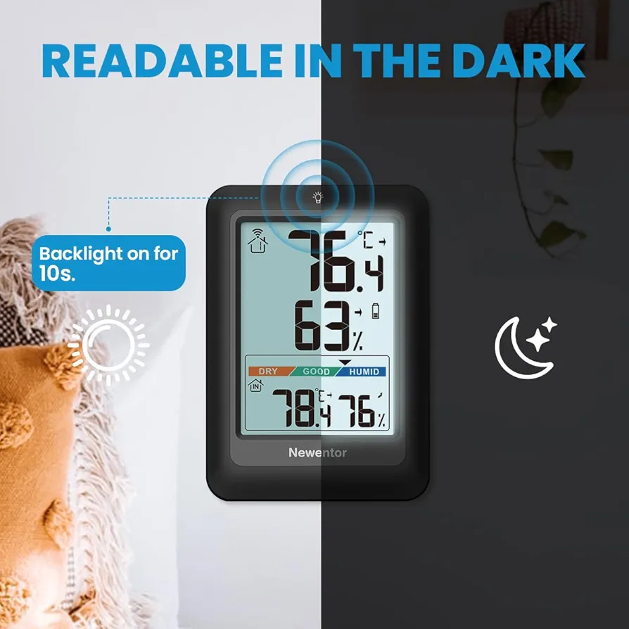 Newentor Thermometer & Hygrometer یک دستگاه پیشرفته و دقیق برای اندازهگیری دما و رطوبت داخلی و خارجی است که با طراحی مدرن و قابلیتهای کاربردی، زندگی روزمره شما را آسانتر میکند. این ابزار کوچک و سبک، اطلاعات مهم محیطی را بهصورت بلادرنگ نمایش میدهد و با حسگر بیسیم داخلی و خارجی، امکان ردیابی شرایط هوایی خانه، محل کار یا محیطهای بیرونی را فراهم میکند.