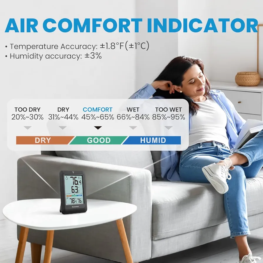 حسگر بیسیم این محصول قادر است تا فاصله حدود ۱۰۰ متر (در فضای باز) را پوشش دهد و دادهها را بهصورت دقیق به واحد اصلی منتقل کند. علاوه بر این، دستگاه دارای هشدار راحتی رطوبت است که با رنگبندی یا نمادهای ساده به شما اطلاع میدهد که محیط خشک، متعادل یا مرطوب است. استفاده از باتری قابل تعویض باعث میشود دستگاه بدون نیاز به برق مستقیم، کارایی بالایی داشته باشد و در هر مکانی قابل استفاده باشد.