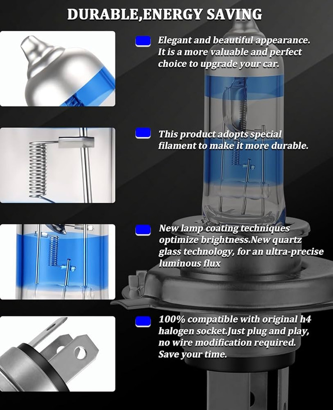 طراحی دقیق رشته لامپ در مدل H4 باعث میشود نور بهصورت یکنواخت پخش شود و خط نور (Cut-off Line) کاملاً استاندارد باقی بماند. این موضوع برای جلوگیری از خیره کردن رانندگان مقابل بسیار مهم است و چراغهایی استاندارد و کاملاً E-Mark ارائه میدهد.
