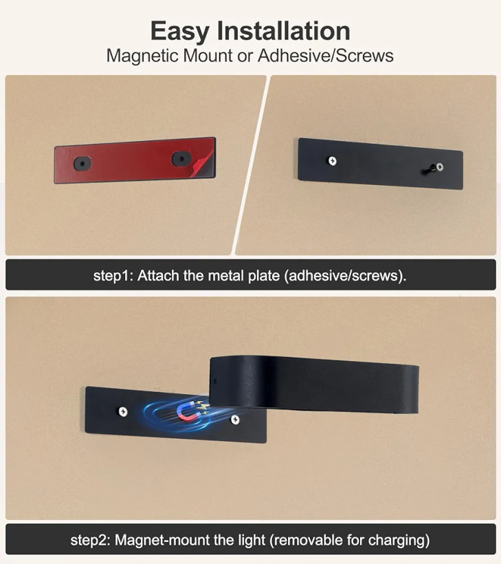 نصب این چراغ بدون نیاز به برقکشی انجام میشود و معمولاً با اتصال مغناطیسی یا چسب قوی امکانپذیر است؛ بنابراین حتی برای افراد غیرمتخصص نیز نصب آن ساده و ایمن است. بدنه مقاوم، وزن سبک و طراحی مدرن باعث شده این چراغ علاوهبر کارایی بالا، جلوه زیبایی نیز به فضا بدهد.