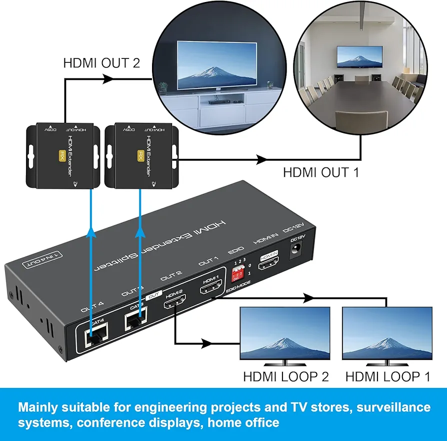 این HDMI Extender با قابلیت تقسیم سیگنال یک به دو (1x2 Splitter)، به شما اجازه میدهد همزمان یک منبع تصویری را روی دو نمایشگر مختلف نمایش دهید. ویژگی Loop-Out در گیرنده امکان اتصال یک نمایشگر محلی نزدیک به منبع را نیز فراهم میکند. سیستم Auto EQ داخلی، کیفیت سیگنال را در طول کابلهای طولانی بهینهسازی کرده و از افت کیفیت جلوگیری میکند.