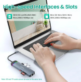 این هاب همچنین دارای سه پورت USB 3.0 با سرعت انتقال 5Gbps است که اتصال انواع فلش، هارد اکسترنال، موس و کیبورد را بهراحتی ممکن میسازد. وجود اسلات SD و TF نیز فرایند انتقال تصاویر و ویدئوها را برای عکاسان و تولیدکنندگان محتوا بسیار سریع و ساده کرده است. پشتیبانی از USB-C Power Delivery تا 100 وات نیز این امکان را میدهد که دستگاه شما همزمان شارژ شده و همه پورتها بدون افت توان فعال باشند.