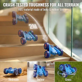 چراغهای LED جذاب در جلو و عقب خودرو، بازی را حتی در محیطهای کمنور هیجانانگیز میکند و با لاستیکهای مقاوم و طراحی تمامزمینی، ماشین میتواند روی چمن، خاک، سنگفرش و حتی سطوح لغزنده حرکت کند.