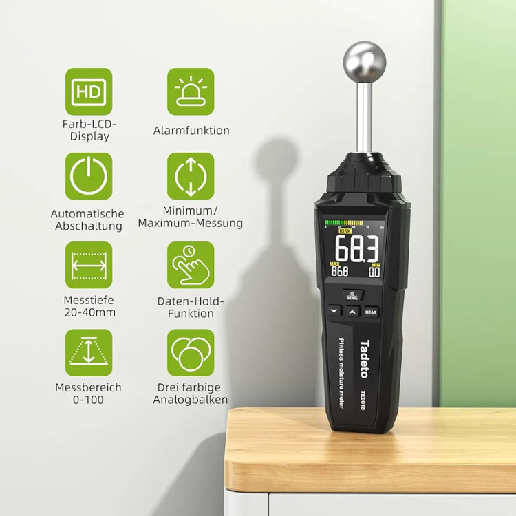 TE0015 Moisture Meter غیر مخرب یک ابزار حرفهای برای اندازهگیری رطوبت در انواع مصالح مانند چوب، سیمان، گچ، کاشی و بتن است، بدون آنکه سطح آسیب ببیند. این دستگاه با تکنولوژی غیر مخرب خود امکان بررسی سریع و دقیق رطوبت را فراهم میکند، بهطوری که دیگر نیازی به سوراخ کردن یا جدا کردن مصالح نیست.