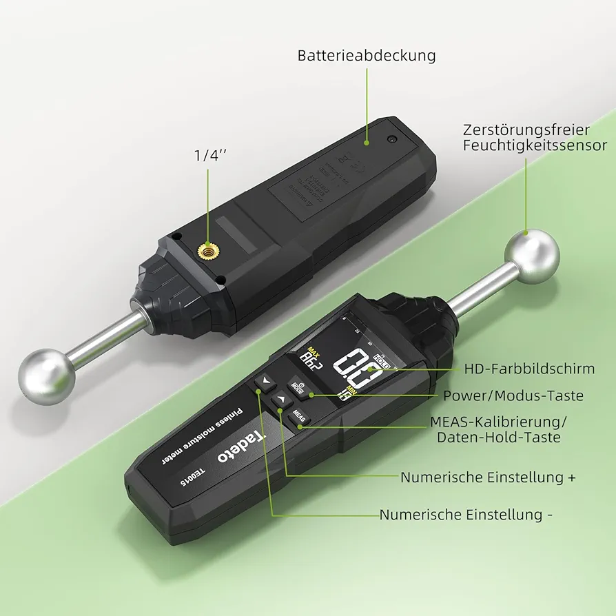 TE0015 Moisture Meter غیر مخرب یک ابزار حرفهای برای اندازهگیری رطوبت در انواع مصالح مانند چوب، سیمان، گچ، کاشی و بتن است، بدون آنکه سطح آسیب ببیند. این دستگاه با تکنولوژی غیر مخرب خود امکان بررسی سریع و دقیق رطوبت را فراهم میکند، بهطوری که دیگر نیازی به سوراخ کردن یا جدا کردن مصالح نیست.