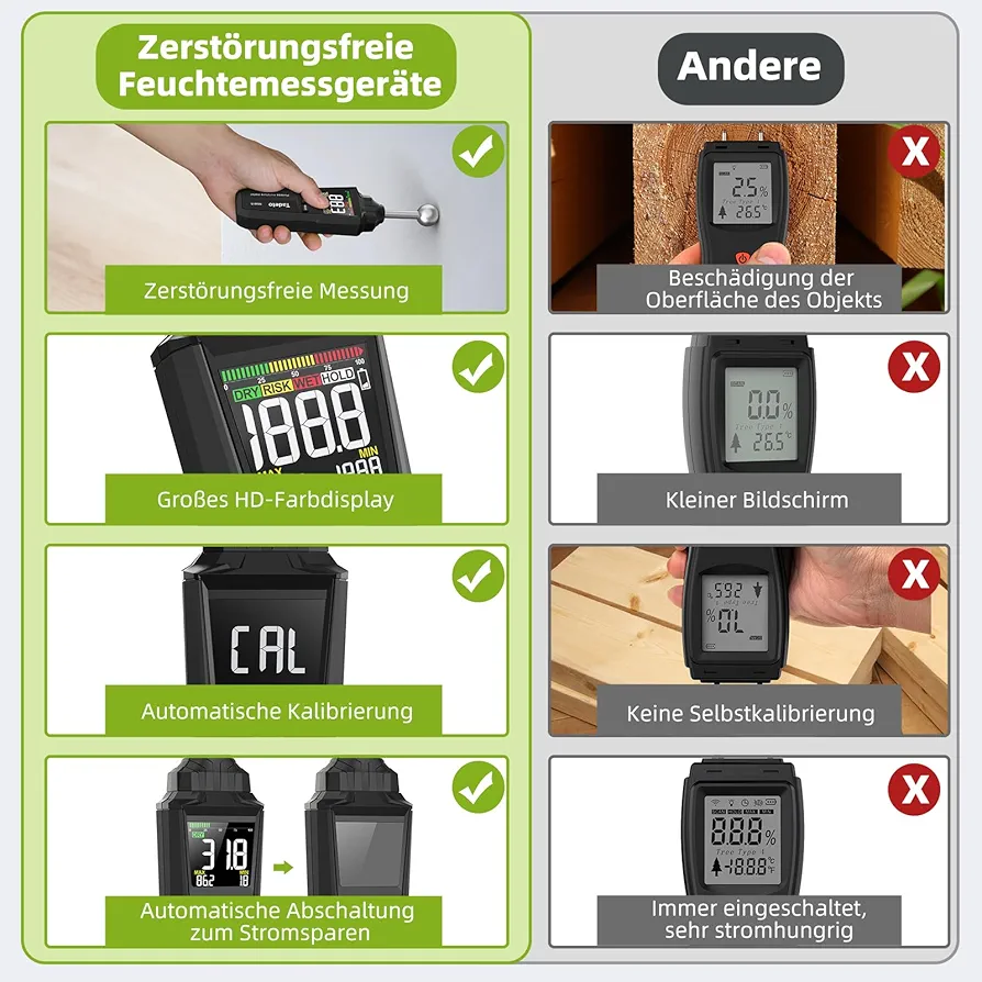 چوب، بتن، سیمان، گچ و کاشی. این دستگاه بدون آسیب رساندن، رطوبت را اندازهگیری میکند.