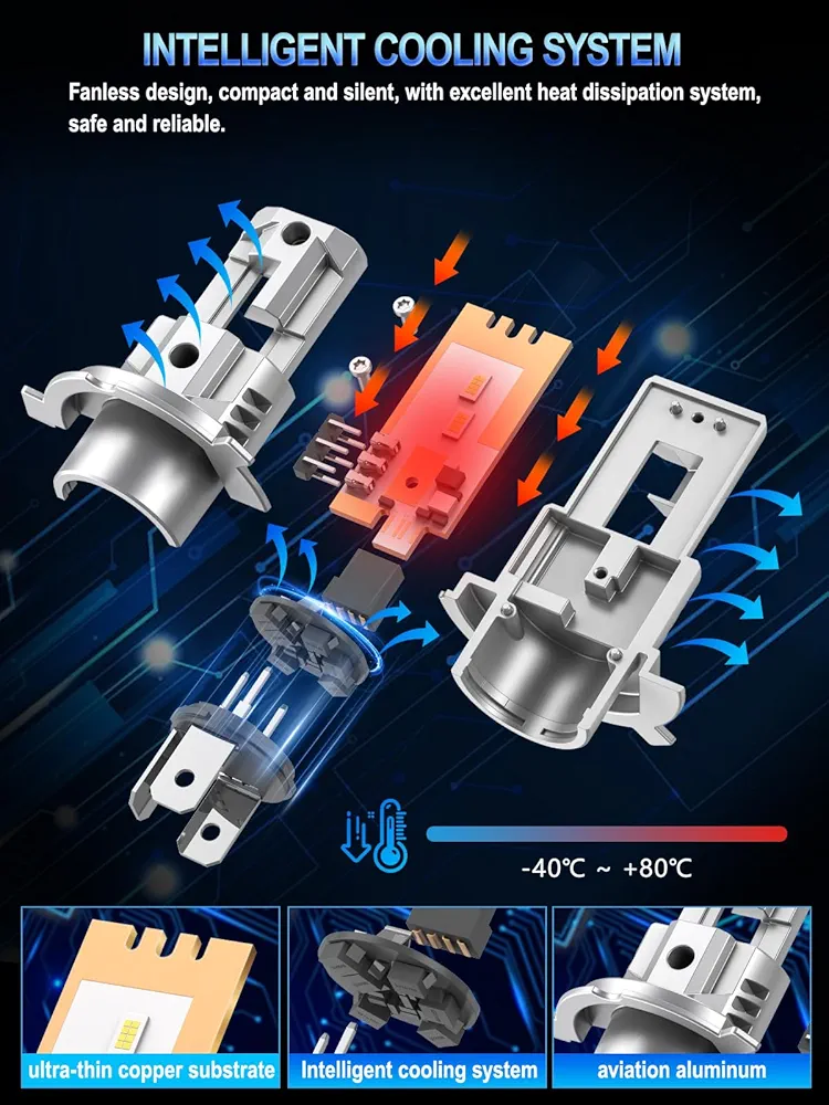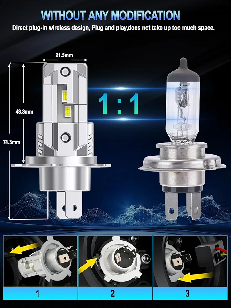 این محصول با طراحی Plug & Play مناسب برای سوکتهای H4 است و نصب آن بدون نیاز به تغییر سیمکشی یا ابزار پیچیده امکانپذیر است. بدنه چراغ از مواد با کیفیت بالا ساخته شده که مقاومت در برابر حرارت و لرزش را تضمین میکند و طول عمر طولانی دارد. سیستم خنککننده داخلی (فن یا هیتسینک) از داغ شدن LED جلوگیری کرده و کارایی نوری ثابت را در طول زمان حفظ میکند.