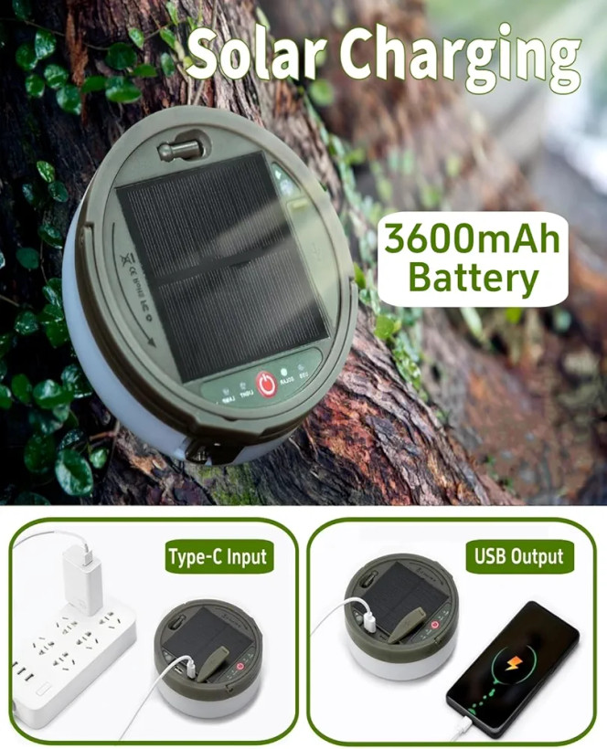 یکی از مهمترین مزیتهای این چراغ، منبع تغذیه دوگانه آن است. شما میتوانید با استفاده از پنل خورشیدی دستگاه را در طول روز شارژ کنید و در شرایط اضطراری نیز از طریق پورت USB-C آن را به پاوربانک، لپتاپ یا هر منبع شارژ دیگری متصل نمایید. باتری داخلی قدرتمند 3600 میلیآمپری این محصول توانایی تأمین روشنایی طولانیمدت را داشته و حتی در مواقع ضروری میتواند بهعنوان پاوربانک برای شارژ تلفن همراه نیز مورد استفاده قرار گیرد.