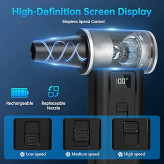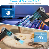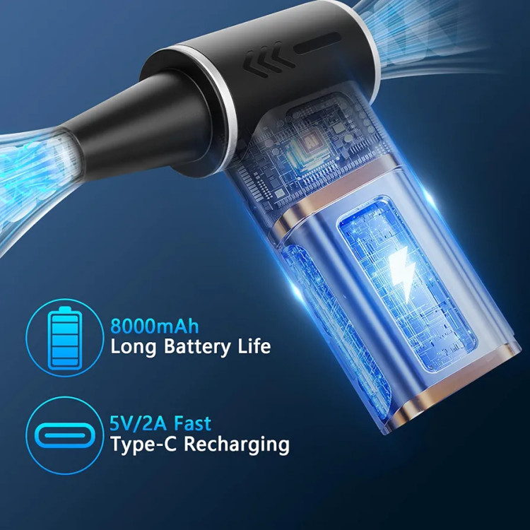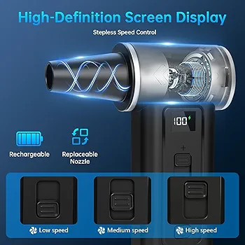 باتری 8000mAh امکان استفاده طولانی و بدون وقفه را فراهم میکند و نمایشگر دیجیتال دستگاه نیز میزان شارژ و قدرت باد را بهوضوح نشان میدهد. وجود بیش از 100 سطح تنظیم سرعت باعث میشود بتوانید دقیقاً قدرت باد مناسب برای هر کار را انتخاب کنید—از تمیز کردن قطعات ظریف الکترونیکی تا دمندگی پرقدرت برای پاکسازی گوشههای سخت.