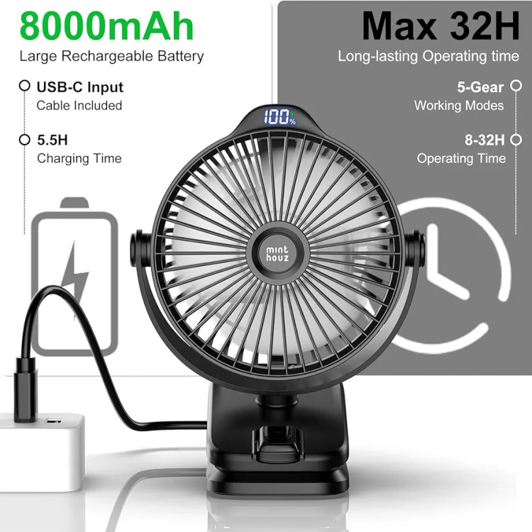 پنکه شارژی گیرهای Minthouz 8000mAh یک انتخاب حرفهای برای خنکسازی سریع و قابلحمل در خانه، محل کار و فضای باز است. این پنکه قابل حمل با طراحی گیرهای قدرتمند، بهراحتی روی لبه میز، تخت، کالسکه کودک، چادر مسافرتی یا حتی تجهیزات ورزشی نصب میشود و با باتری پرظرفیت 8000 میلیآمپرساعتی، ساعتها باد خنک و یکنواخت تولید میکند. اگر به دنبال پنکه شارژی مخصوص کالسکه یا یک پنکه رومیزی بیصدا هستید که در سفر و طبیعتگردی هم همراهتان باشد، Minthouz گزینهای ایدهآل است.