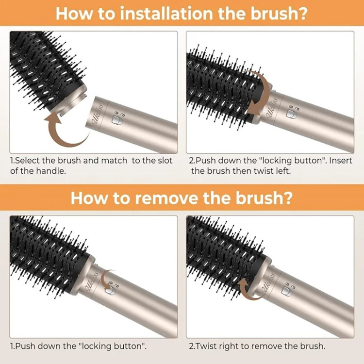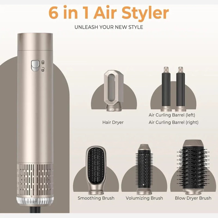 ۶ سری مختلف شامل برس گرد، بیگودی، صافکننده، نازل تمرکز هوا و برس حالتدهنده.