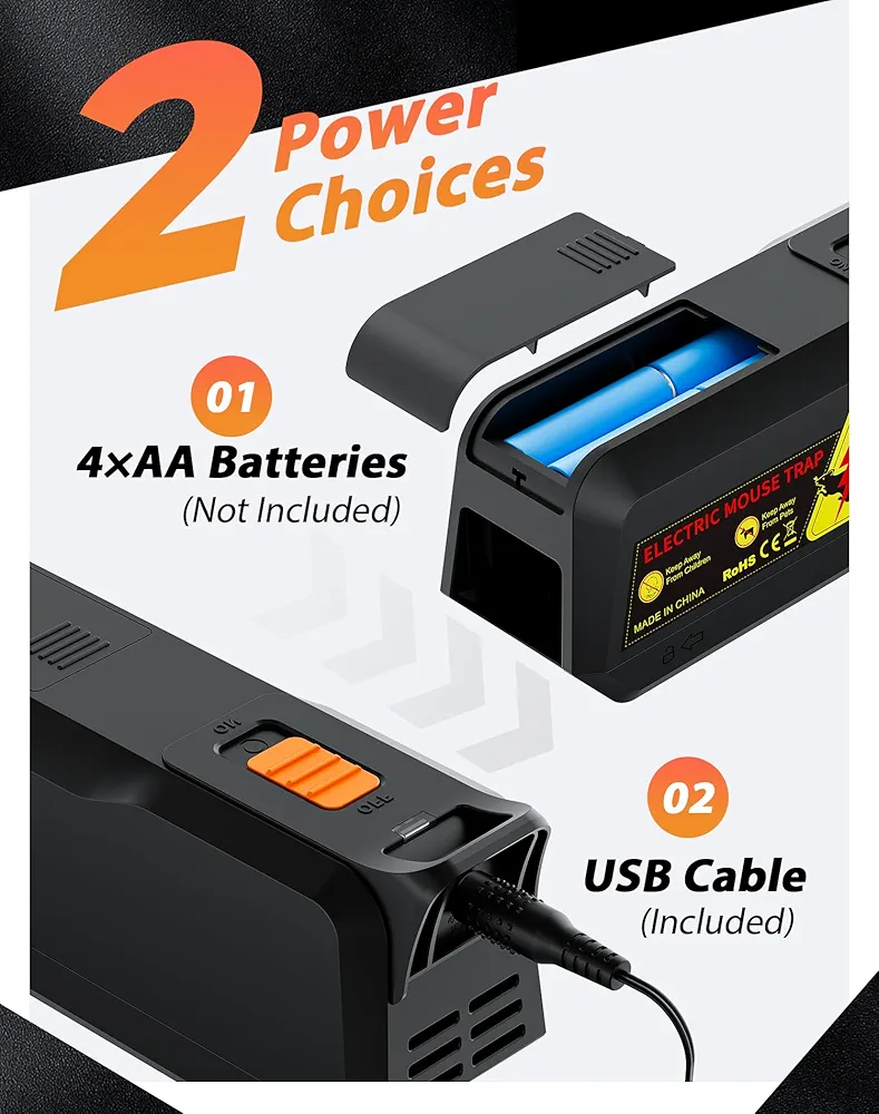 پاسخ: این تله هم با ۴ باتری AA و هم با کابل USB قابل استفاده است و امکان نصب در مکانهای بدون برق را فراهم میکند.