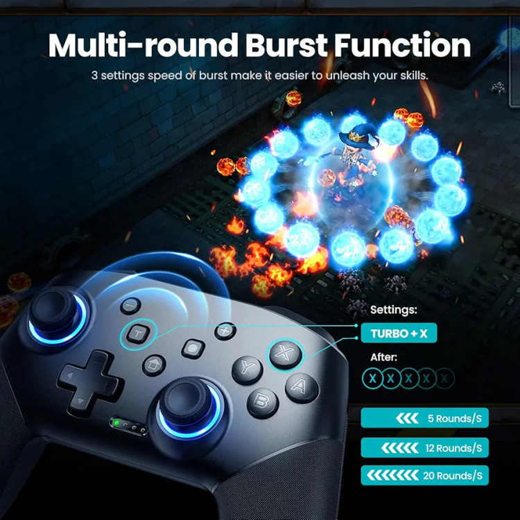 این کنترلر دارای حسگر ژیروسکوپ ۶ محوره (۶-axis gyro) است که در بازیهای حرکتی یا ورزشی کمک شایانی به تجربه واقعیتر میکند. علاوه بر آن، موتورهای لرزش (ویبره) با چهار سطح مختلف، بازخورد لمسی غنیتری به بازیکن ارائه میکنند. عملکرد Turbo نیز با ۳ حالت (مثلاً ۵، ۱۲ و ۲۰ شلیک در ثانیه) امکان شلیک پشت سر هم را آسان میسازد. شارژدهی باتری حدود ۱۰ تا ۱۵ ساعت در شرایط فعال بودن نورپردازی است که با کابل USB-C شارژ میشود.