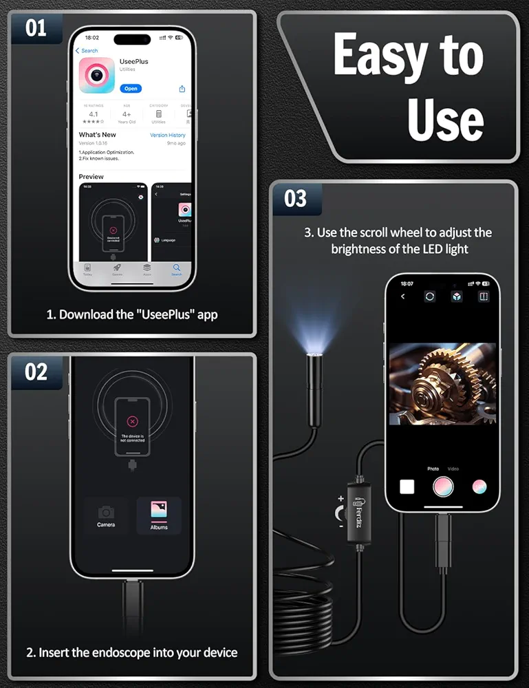 این دوربین آندوسکوپی موبایلی به گوشیهای اندروید و آیفون متصل میشود و از طریق اپلیکیشن اختصاصی امکان مشاهده تصویر زنده، عکسبرداری و فیلمبرداری را فراهم میکند. نصب و استفاده از آن ساده بوده و برای تکنسینهای تأسیسات، تعمیرکاران خودرو، برقکاران و حتی کاربران خانگی انتخابی ایدهآل محسوب میشود.