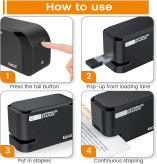 این مدل با ظرفیت منگنه تا ۲۰ برگ کاغذ ۸۰ گرمی، برای کارهای اداری، مدارس، دفاتر حسابداری و حتی استفاده خانگی ایدهآل است. پشتیبانی از سوزنهای استاندارد 24/6 و 26/6 باعث میشود بهراحتی از ملزومات رایج بازار استفاده کنید. همچنین قابلیت کار با آداپتور برق شهری یا ۴ باتری AA، انعطافپذیری بالایی به شما میدهد؛ بنابراین چه پشت میز کار باشید و چه در محیطی بدون دسترسی به پریز برق، این دستگاه همراه شماست.
