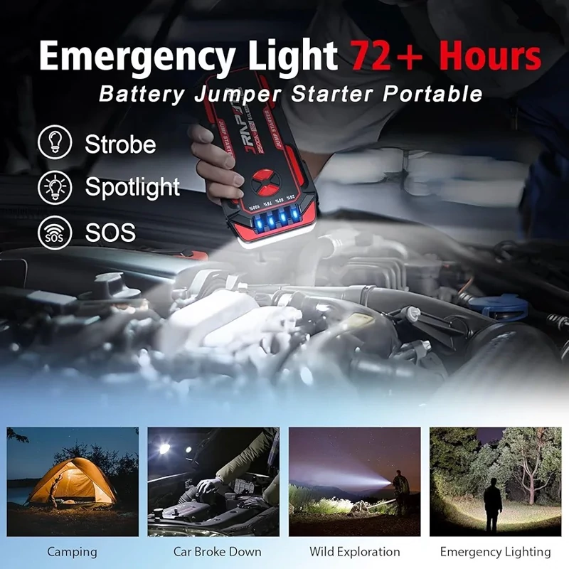این استارتر علاوه بر عملکرد اصلی خود، به عنوان پاوربانک قابلحمل نیز عمل میکند و از طریق درگاه USB و Type-C میتواند تلفن همراه، تبلت یا سایر گجتهای شما را شارژ کند. چراغ قوه LED قدرتمند با حالتهای روشنایی عادی، استروب، SOS و هشدار قرمز-آبی در مواقع اضطراری یا در تاریکی شب به کمک شما میآید.